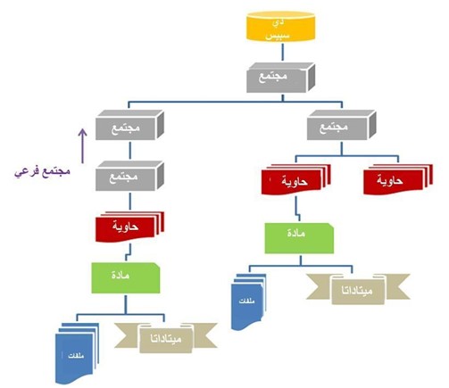 ومن هنا نجد أن الوحدة الأساسية في مصطلحات نظام دي سبيس هي المادة، والتي يمكن أن تكون: صورة رقمية، أو ملف PDF، أو أصول بيانات، إلى غير ذلك. ويتم تجميع المواد في حاويات، والحاويات يتم تنظيمها في مجتمعات. ويمكن توضيح الفرق بين المواد، والحاويات، والمجتمعات من خلال الشكل التالي: